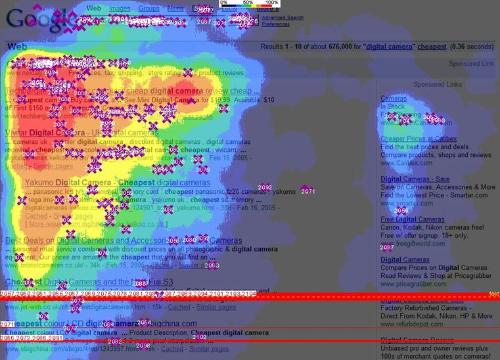 Hay estudios del comportamiento del ojo humano dentro de las páginas de resultados de Google para analizar qué partes de estas páginas son las más llamativas para los usuarios que realizan cualquier búsqueda. Útiles para planificar estrategias.